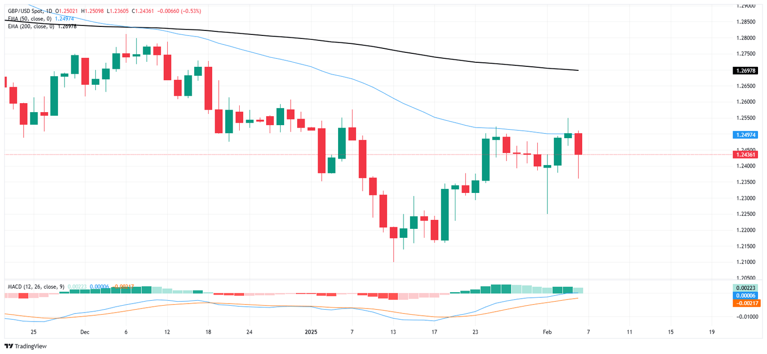 GBP/USD shuddered on Thursday, punching in a technical rejection from key averages and testing below the 1.2400 handle. The Bank of England (BoE) trimmed interest rates by another 25 bps, but struck a hawkish tone that saw rate markets tune down their bets of further rate cuts through the remainder of 2025.