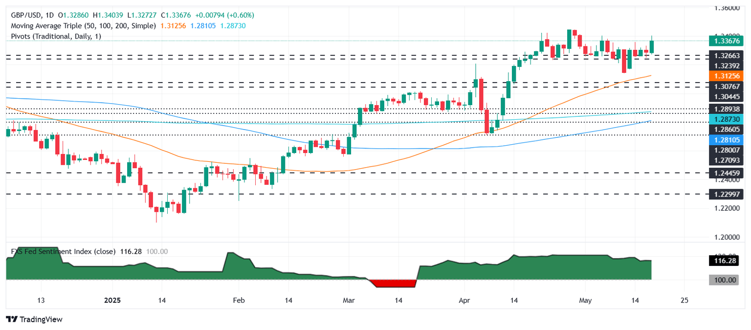 The Pound Sterling (GBP) posted solid gains on Monday as the US Dollar (USD) got battered due to Moody’s lowering US debt rating to Aa1, a headwind for the Greenback. At the time of writing, GBP/USD trades at 1.3360, up 0.71%.