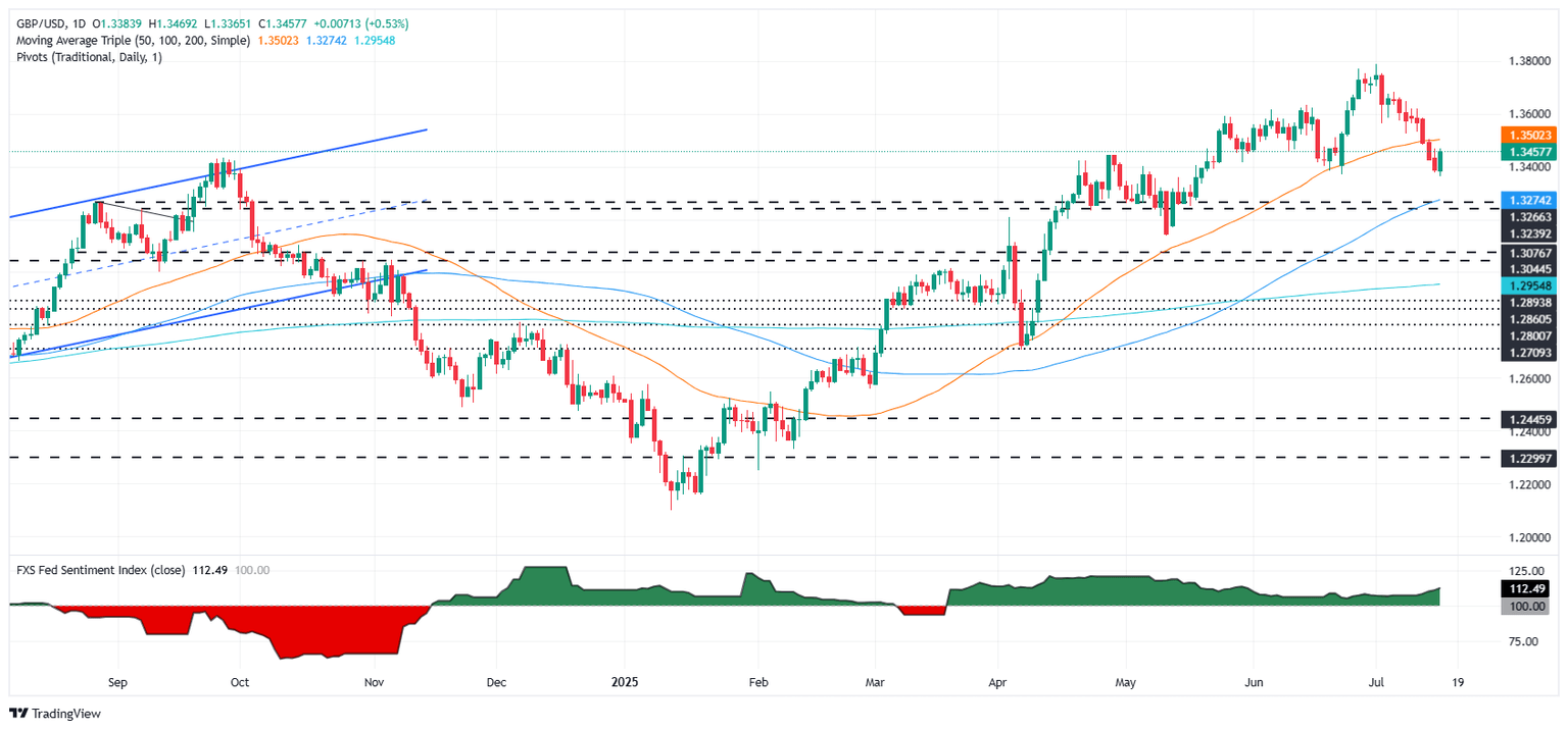 The GBP/USD pair reverses its course and rallies as the latest US Producer Price Index (PPI) data reignites hopes of a rate cut by the Federal Reserve (Fed), while headlines suggest that US President Donald Trump may consider firing Fed Chair Jerome Powell. At the same time, inflation on the consumer side in the UK surprised investors, exceeding forecasts. At the time of writing, the pair trades at 1.3454, up by 0.55%.