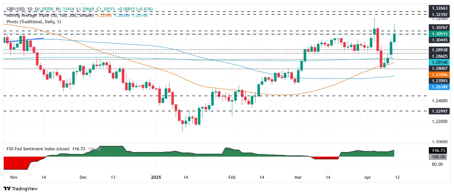 The Pound Sterling (GBP) extends its gains versus the US Dollar (USD) as the US-China trade war escalates, with Beijing imposing 125% tariffs on US goods. Trade policies continue to drive price action, with economic data taking a backseat. At the time of writing, GBP/USD trades at 1.3067, up 0.77%.