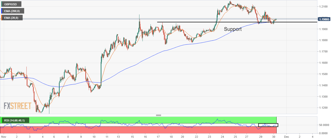 GBP/USD has witnessed a responsive buying action after testing the horizontal support plotted from November 17 high of around 1.1940. The 200-period Exponential Moving Average (EMA) at 1.1960 has acted as major support for the Cable. The Pound bulls have also pushed the Cable above the 20-EMA at 1.1980, which indicates that the short-term trend is bullish now.