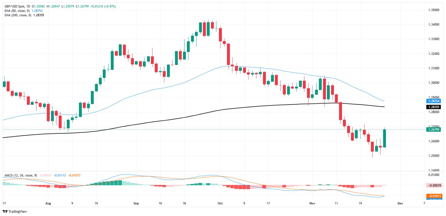 Wednesday’s Cable rebound has the pair taking a fresh run at the 1.2700 handle, adding nearly a full percent through the day’s trading and priming GBP/USD bulls for a new leg back into the high side following a 7% top-to-bottom decline from September’s peaks at 1.3434. However, long positioning is set to run into new challenges at the 200-day Exponential Moving Average (EMA) near 1.2835.