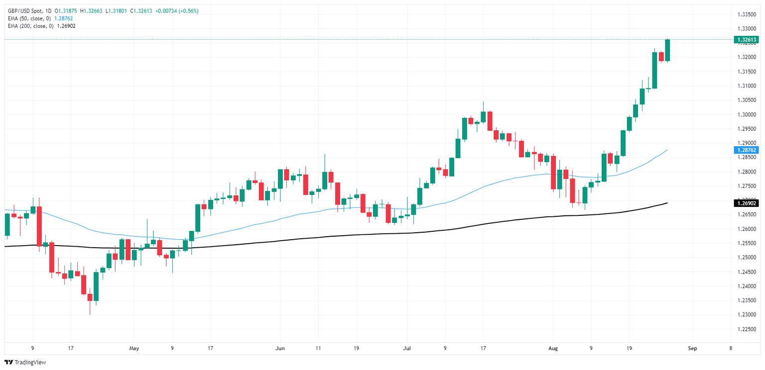 GBP/USD tested into a fresh multi-year high on Tuesday, easing into a 29-month peak of 1.3266 as the Pound Sterling continues to catch a ride on a broad-market Greenback sell wave. Investors have piled into hopes for a September rate cut from the Federal Reserve (Fed), and US Personal Consumption Expenditure Price Index (PCE) inflation figures not due until Friday leave markets with little meaningful data to chew on until then.