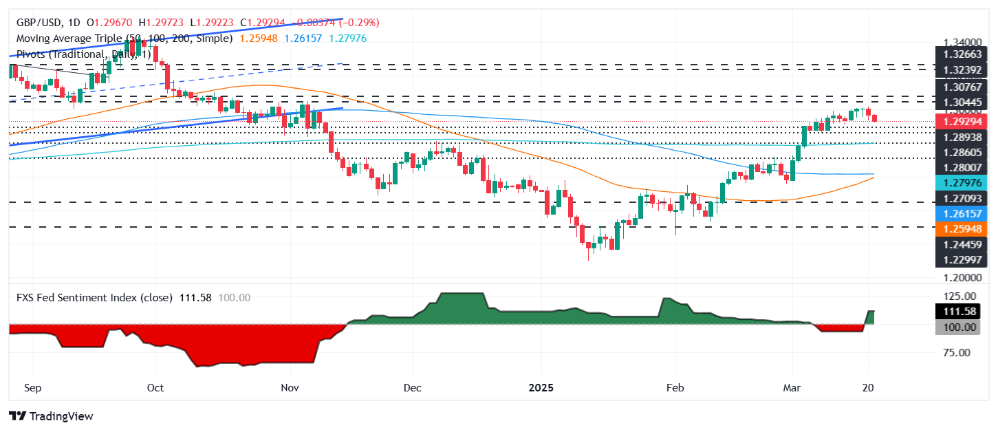 The Pound Sterling (GBP) is dropping some 0.29% against the US Dollar (USD) on Friday, set to end the week unchanged after major central banks featured monetary policy decisions led by the Federal Reserve (Fed) and the Bank of England (BoE). At the time of writing, GBP/USD is trading at 1.2931 after hitting a daily peak of 1.2969.