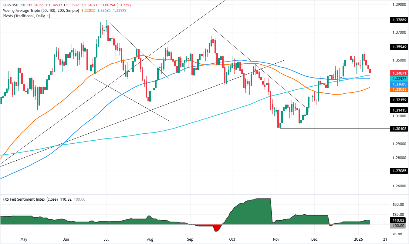 The Pound Sterling (GBP) retraces on Friday after December’s Nonfarm Payrolls report delivered mixed figures, though traders reduced bets for an interest rate cut in January. At the time of writing, GBP/USD trades at 1.3412 after reaching a high of 1.3451.