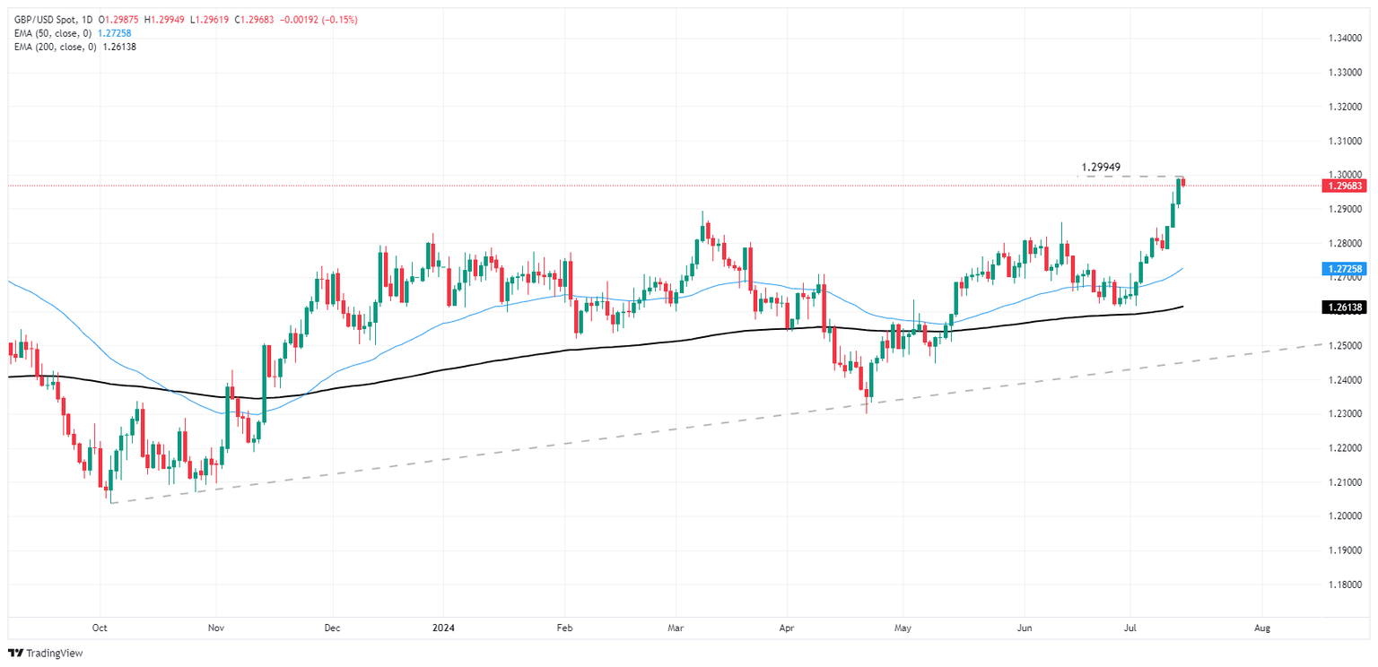 Cable bidding took a break on Monday, snapping a three-day winning streak and etching in a thin bearish candle after the pair closed in the green for all but two of the previous 12 consecutive trading days. GBP/USD’s swing low towards 1.2600 in late June failed to pierce the major price handle, sending bullish bids higher, and Monday trading managed to eke out a fresh 12-month high at 1.29949 before pulling back and rotating lower just shy of the 1.3000 key price level.