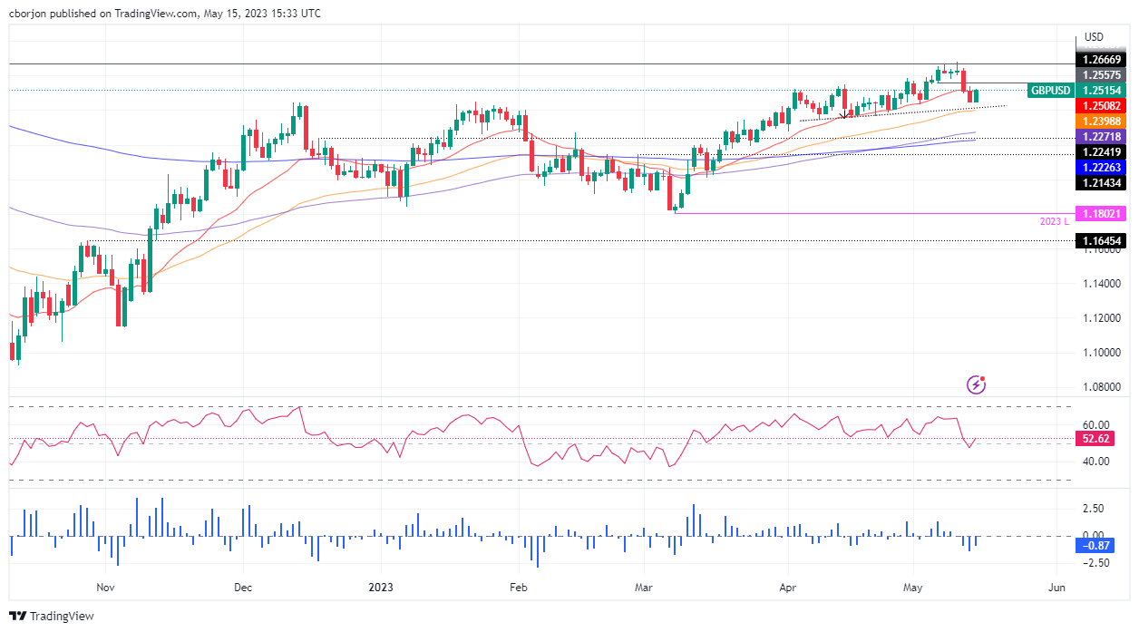 From a technical perspective, the GBP/USD is forming a bullish engulfing candle chart pattern but facing solid resistance at the 20-day Exponential Moving Average (EMA) at 1.2507. If GBP/USD struggles to crack the latter, the aforementioned two-candle pattern could be at risk of being invalidated, thus opening the door for losses below the psychological 1.2500 mark. If that scenario plays out, the GBP/USD next support would be May 15 at 1.2443, followed by the 50-day EMA at 1.2398.