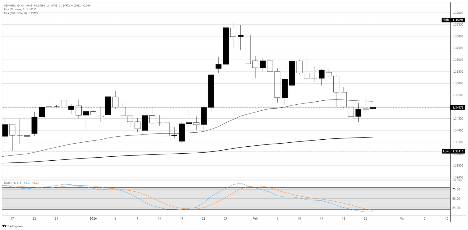 GBP/USD was essentially flat on Tuesday, drifting around 1.3500 in a quiet session. The pair has pulled back sharply from its late-January high near 1.3870 and is now consolidating in a tight range around the 50-day Exponential Moving Average (EMA), with a cluster of mixed candles over the past two weeks suggesting indecision after the sell-off.