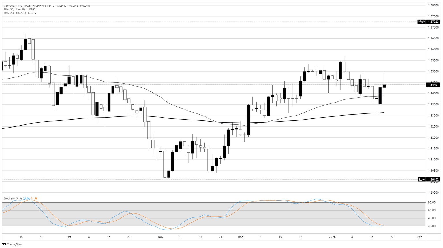 GBP/USD has shown a modest upward bias this week, largely driven by broad-based US dollar weakness rather than strong UK fundamentals. The pair has rebounded from recent lows as geopolitical risk and tariff concerns undermined confidence in the greenback, allowing Sterling to advance even as UK macro data disappointed.