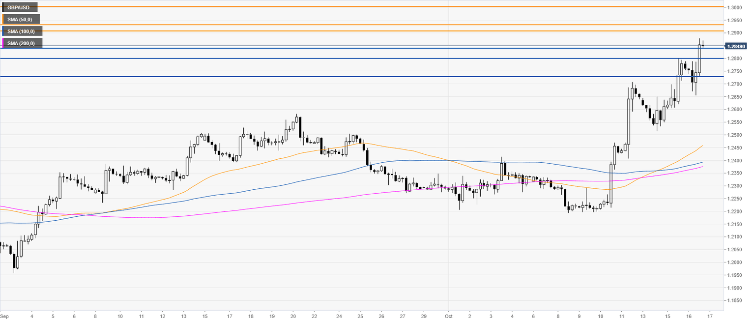 The Sterling, on the daily chart, is trading above its 200-day simple moving average (DSMA). Earlier in the New York session, GBP/USD leaped above 1.2800 as the DUP (Democratic Unionist Party) reportedly accepted Brexit proposals on consent. GBP/USD is trading at its highest level since mid-May 2019.