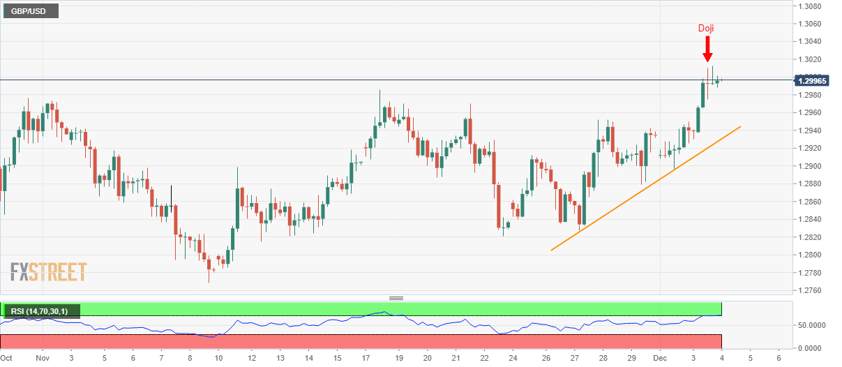 GBP/USD revisits 1.3000 psychological magnets during its initial run-up amid Wednesday morning in Asia. The quote earlier stepped back from October highs with a bearish candlestick formation on the four hour (H4) chart and overbought conditions of 14-bar Relative Strength Index (RSI).