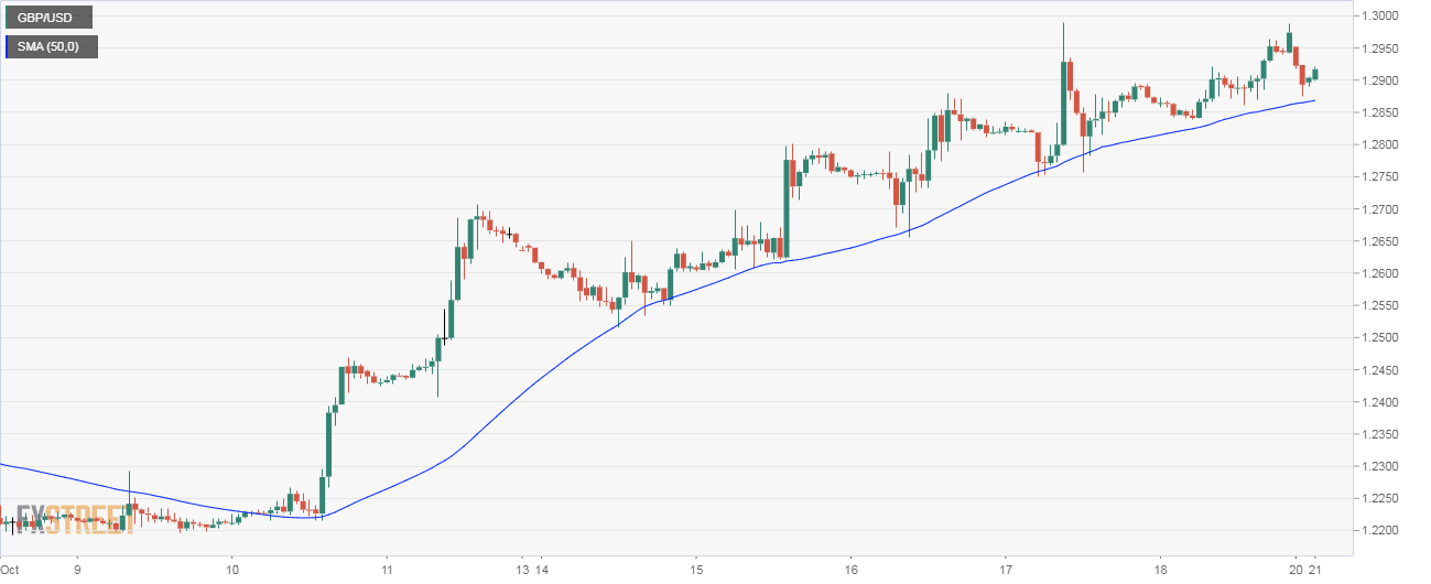 GBP/USD created bullish higher lows at the 50-hour moving average (MA) throughout the recent rally from 1.22 to 1.2990.