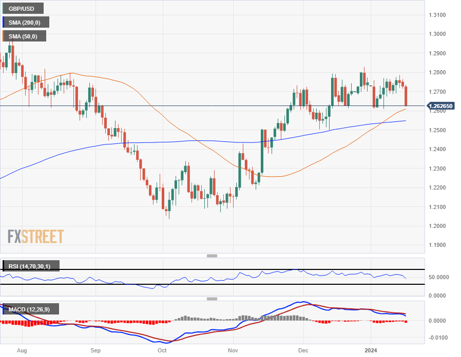 The GBP/USD fell further past the 200-hour Simple Moving Average (SMA) on Tuesday, testing into 2024’s low bids. The pair is poised for a continued drop into the 1.2600 handle, but a reversal into the top end will have to overcome a bearish crossover of the 50-hour and 200-hour SMAs in the near-term.