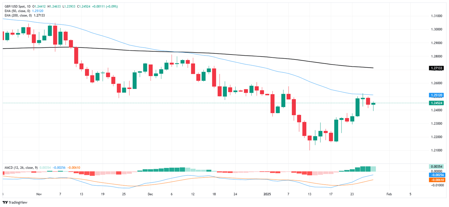 GBP/USD continues to grind through chart paper in the most frustrating position possible, drifting just south of the 50-day Exponential Moving Average (EMA) near 1.2500 but unable to sink decisively below 1.2400. A bullish technical correction appears to have run out of gas, but a meaningful downturn remains off of the cards for now.