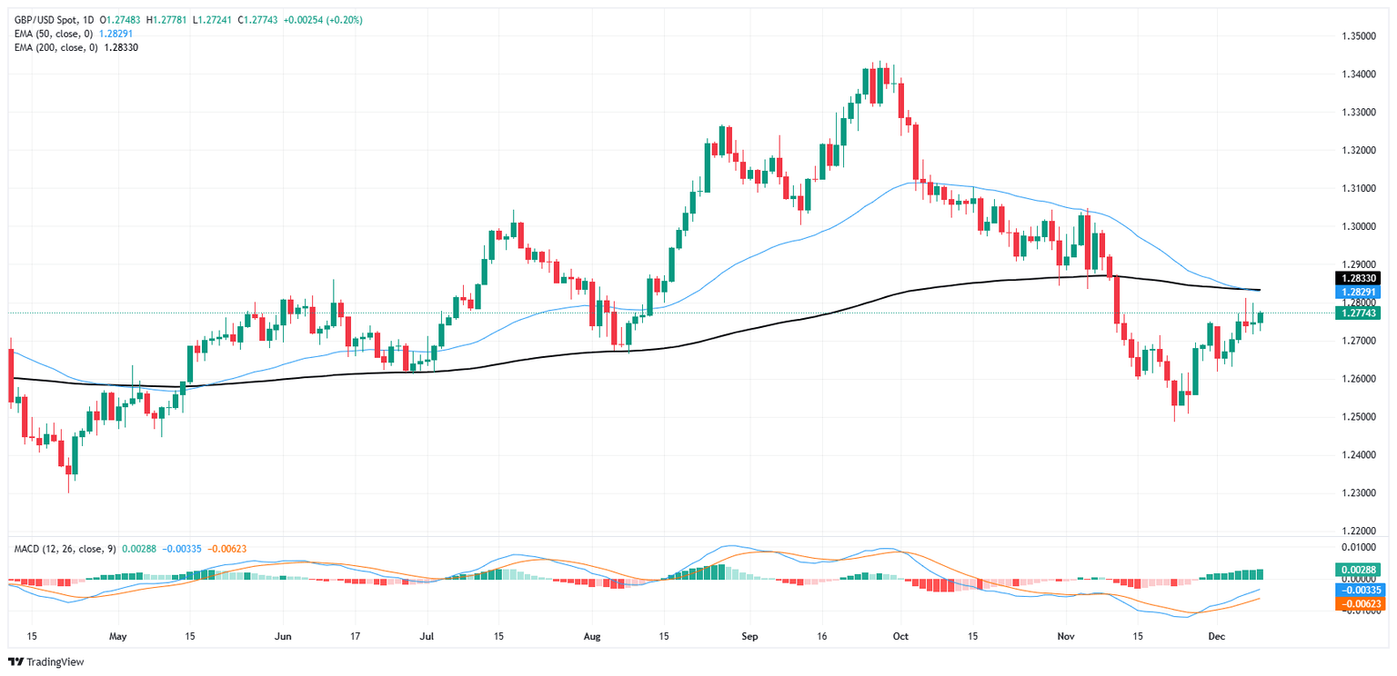 GBP/USD is battling near-term chart churn near the 1.2800 handle, with the pair suspending in a dead zone just south of the 200-day Exponential Moving Average (EMA) near 1.2830. Price action has made a slow, trudging recovery after bottoming out near 1.2500 in late November, but bullish momentum is running into trouble and another leg lower could be chalked into the chart if the 200-day EMA stops being a target and becomes a hard technical barrier.
