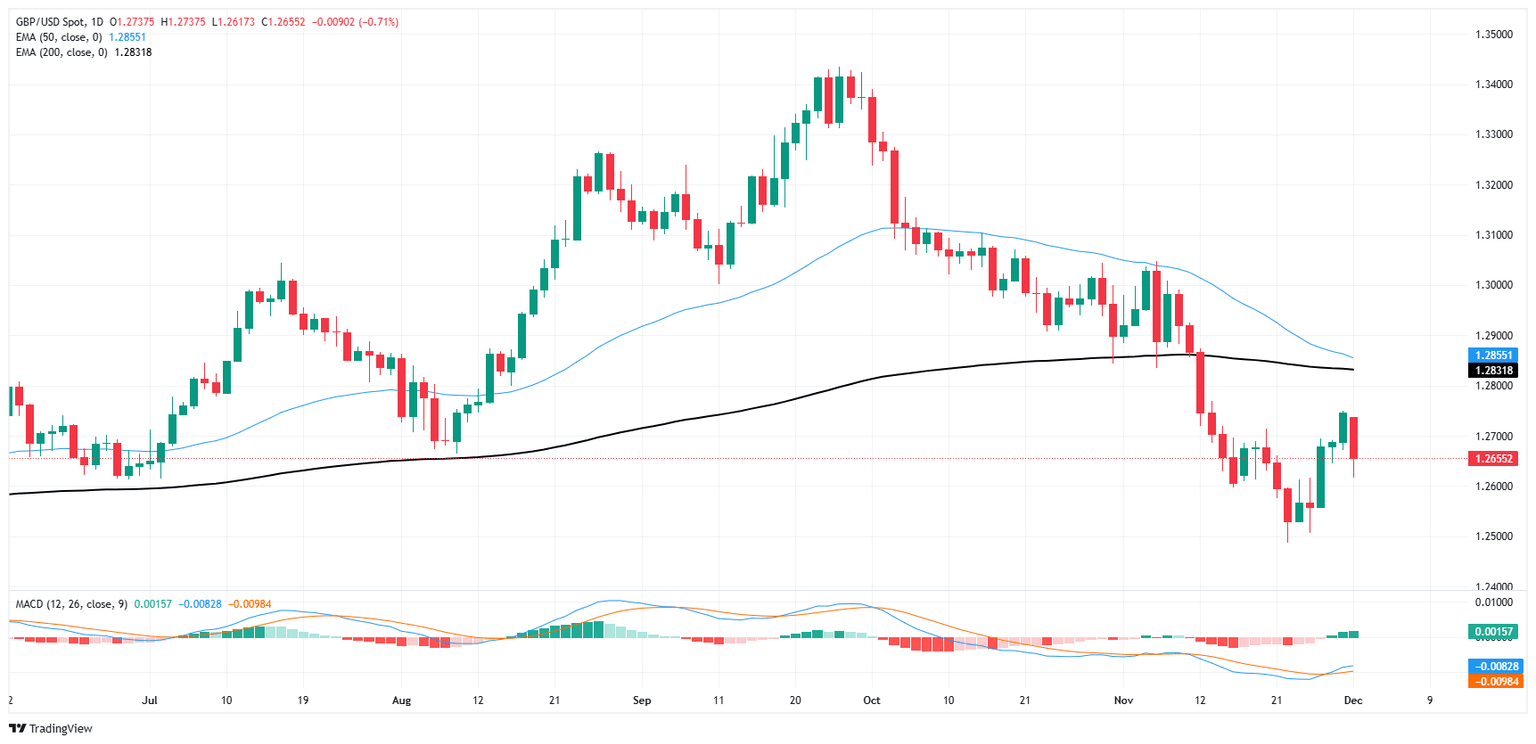 Monday’s declines dragged GBP/USD back below the 1.2700 handle, keeping price action on the bearish side of the 200-day EMA, which is still rolling over into bearish territory near 1.2800. Cable caught a near-term bounce from multi-month lows after declining into 1.2500, but topside momentum remains limited.