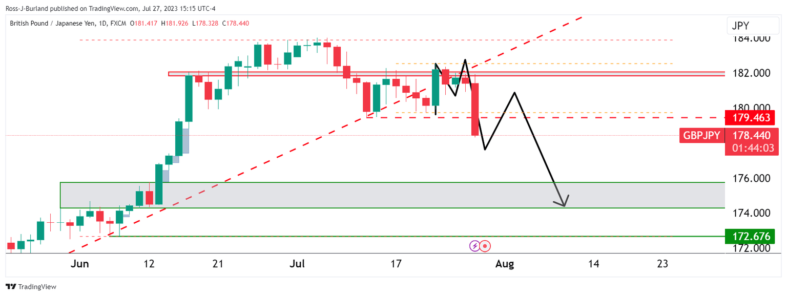 However, that narrative has flipped in New York trade on Thursday and USD/JPY fell from 141.10 to a low of 139.09 when the Nikkei reported '' the Bank of Japan will discuss tweaking its yield curve control policy at a policy board meeting Friday to let long-term interest rates rise beyond its cap of 0.5% by a certain degree, Nikkei has learned, in what would be a shift toward a more flexible policy approach.'' Consequently, GBP/JPY has been dragged deeper below trendline resistance as follows: