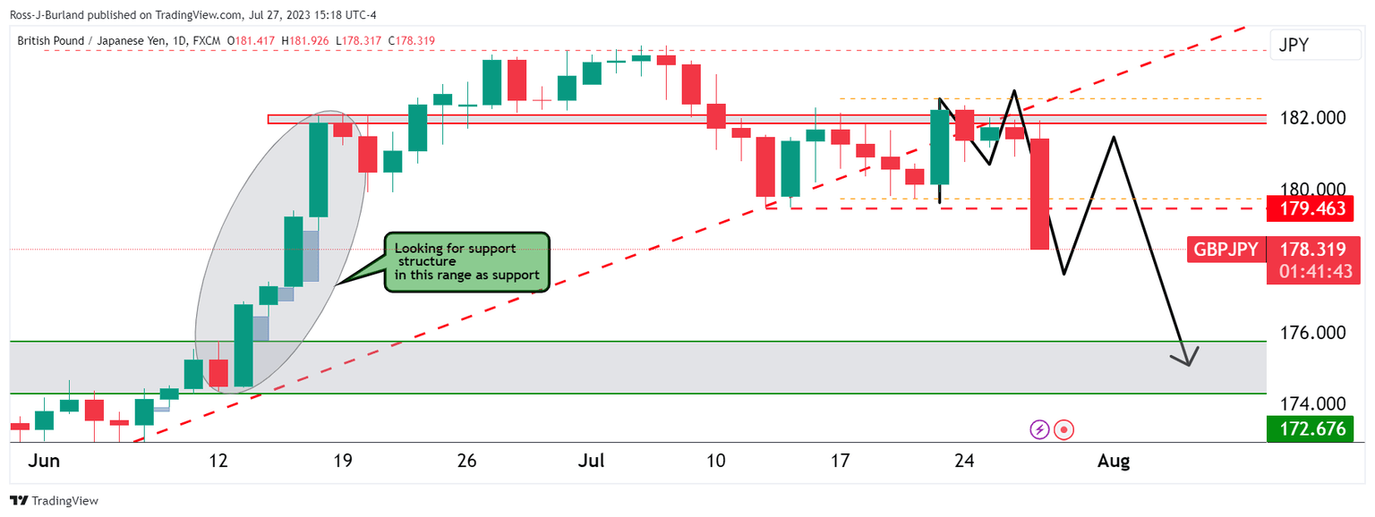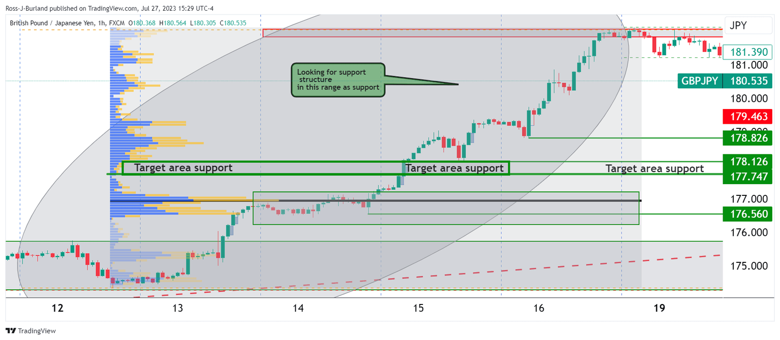 - GBP/JPY drops into a potentially strong area of support in the 177.70/90s as per the hourly structure.
