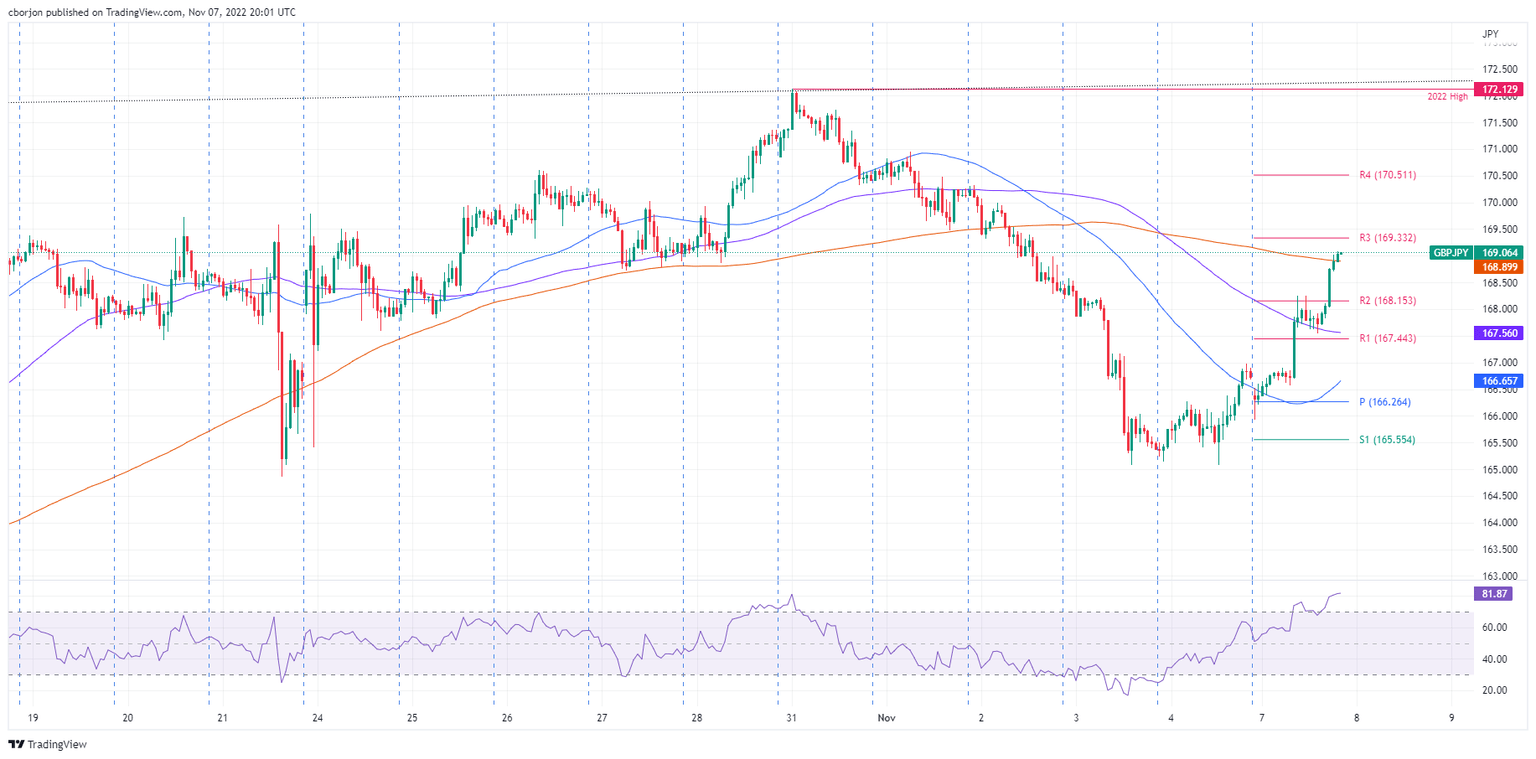 The GBPJPY stages a recovery trimming some of the last week’s losses as market sentiment improves during Monday’s Wall Street session. Factors like US midterm elections and also a mixed US jobs report opened the door for gradual tightening by the Federal Reserve, after hiking four times, 75 bps, for a total of 300 bps in the last meetings, in a period of stubbornly high inflation. At the time of writing, the GBPJPY is trading at 169.06.