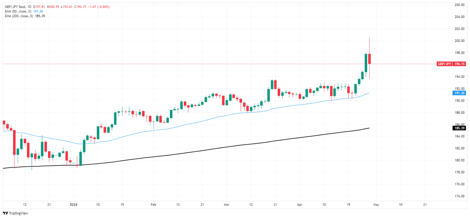 GBPJPY settles near 196.00 after volatile Monday, falls back from 34-year high