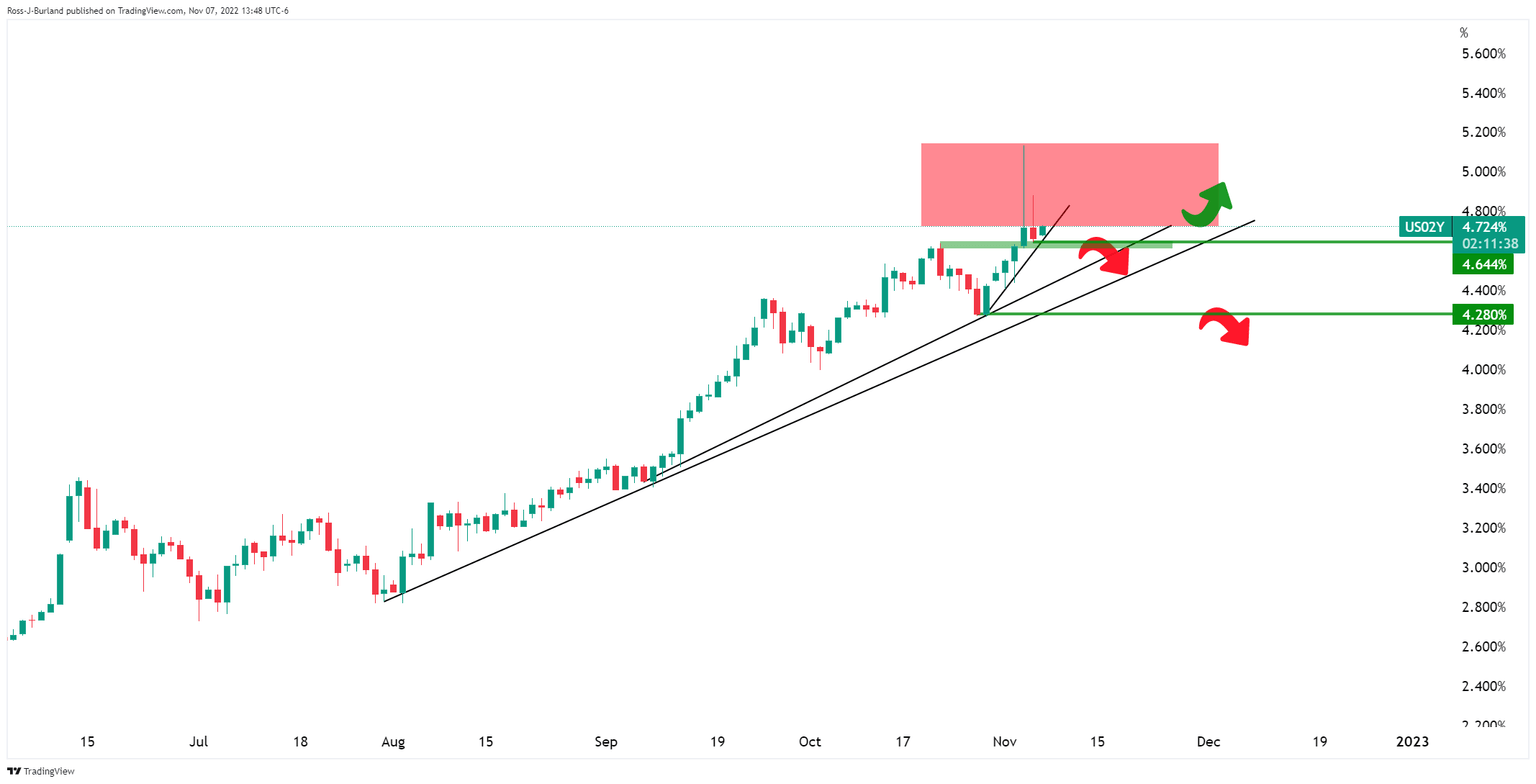 The daily chart shows that there could be some stalling to come from the 2-year yields given the recent wicks and lower highs. A break of the current support near 4.644% opens risk of a significant move lower to test the trendline supports. In turn, such a switch in yields would likely dent the greenback and support Cable higher.