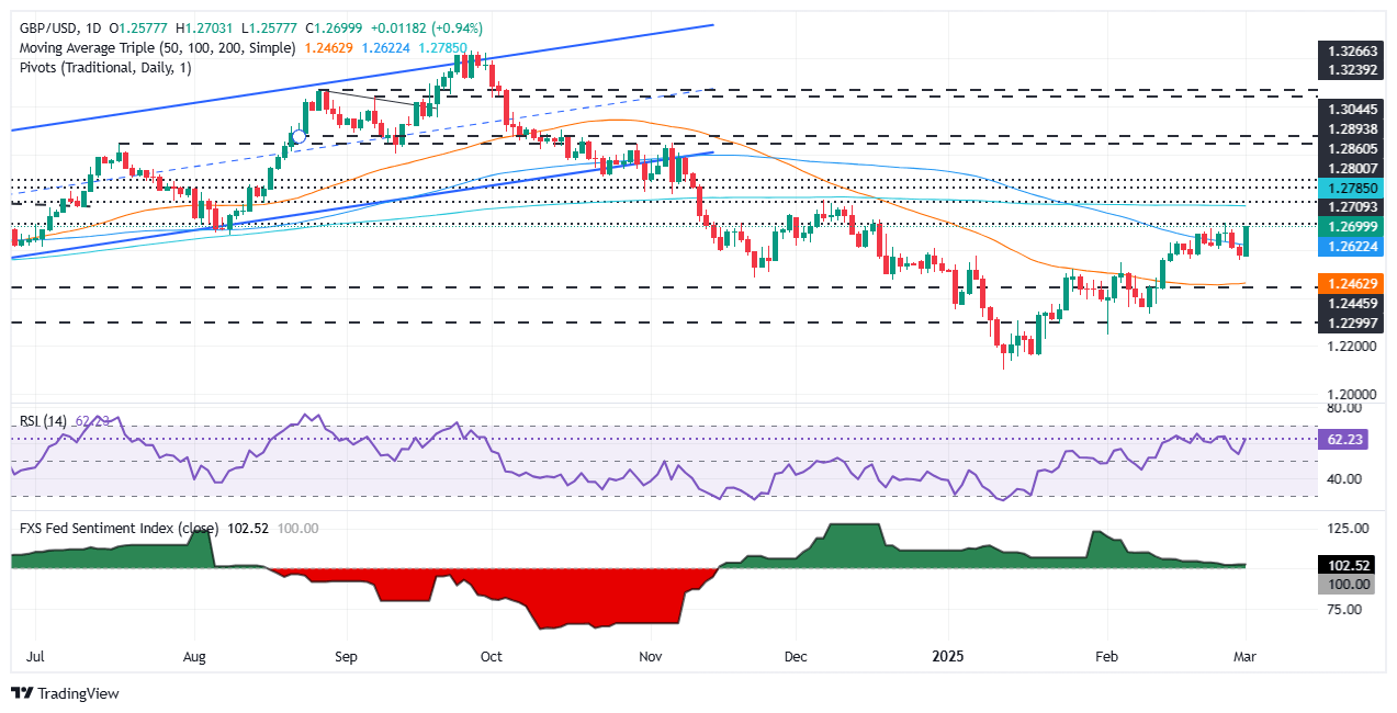 The Pound Sterling (GBP) snaps two days of losses and is rising over 0.89% amid a weaker US Dollar (DXY), which appreciated on Friday following a weaker-than-expected Atlanta GDP Now forecast for Q1 2025. At the time of writing, the GBP/USD is trading at 1.2694 after hitting a daily low of 1.2577.
