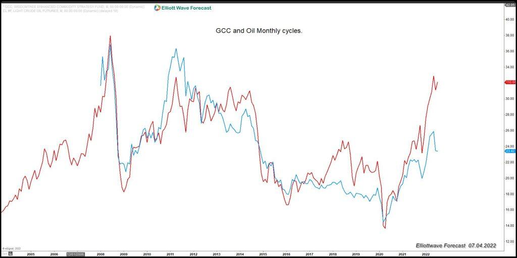 The monthly chart of GCC above shows a three waves pullback since the peak in 2008 into the blue box buying area. Based on the Elliott Wave Theory and common sense, it’s hard to see the Fund breaks below $13.59 again. Thus we believe the nest is the right count of the rally from wave (2) low. As we mentioned previously, the Fund has a strong relationship with Oil, as shown in the following chart: