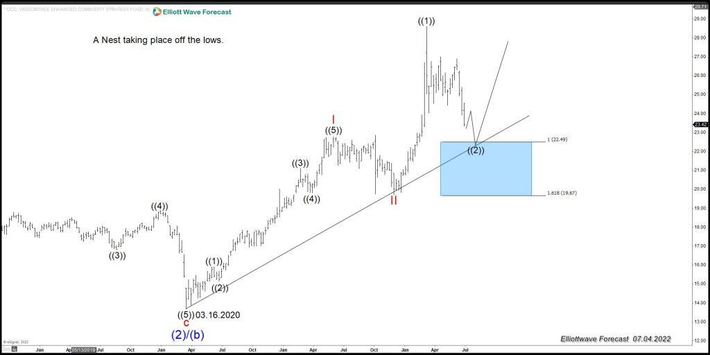 GCC (Wisdom Tree Commodity Strategy Fund) is a great indicator for commodities direction. This Fund is positively correlated with Oil. Previously, we have mentioned the idea that the Fund reached the blue box area back in 03.2020. Since then, it has started a rally which looks like a nest. A nest is a series of 1-2. Most of the time a nest happens before a huge move takes place. The following chart shows what a nest looks like: