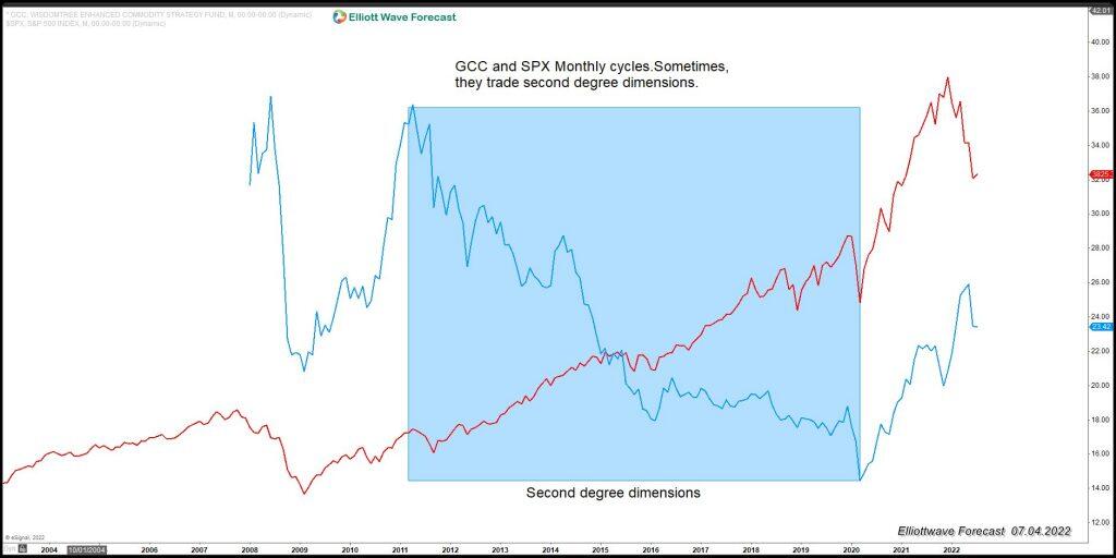 The chart above shows the correlation between GCC and $SPX. As we can see, they correlate in each swing higher/lower. Sometimes they have direct correlation and sometimes in second-degree correlation. The first degree correlation is when they trade in the same direction both in swing as well as overall direction. The second degree correlation is when they agree on the swing direction, but not in the overall direction. In the end, GCC is reacting off the blue box. GCC doing a nest might be a warning for soon-to-happen higher Indices, Commodities, and something in which traders asking for a market crash might not be getting the wish.