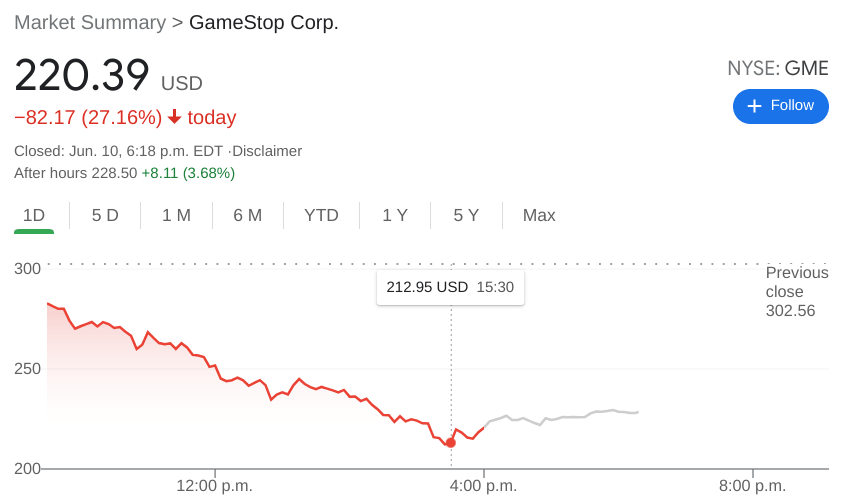 NYSE:GME may be seeing the beginning of the end of its coordinated short squeezes as the SEC and big banks are closing in. Shares of GameStop went into freefall on Thursday, dropping by more than 27% to close the day at $220.39, as investors were less than thrilled following GameStop’s annual shareholder meeting. We previously mentioned that GameStop has a habit of plunging the day after its annual meeting, and it is interesting to see that this year was no different.
