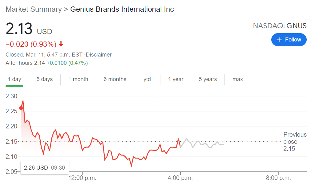 NASDAQ:GNUS cooled off on Thursday amidst a second straight day of the NASDAQ exchange rebounding by 2.5% following its recent correction. Genius Brands fell by 0.93% to close the trading session at $2.13, which has the stock trading above its 50-day and 200-day moving averages once again. Shares are still over 80% lower than the 52-week high price of $11.73, but if you look at the silver lining, they are still well over 4,000% higher than the 52-week low price of $0.05.
