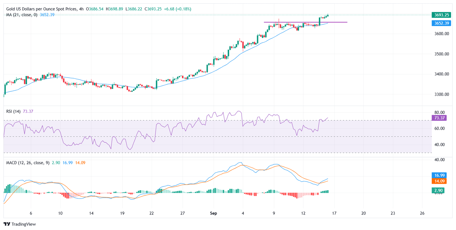 At the time of writing, the metal is trading around $3,695, just shy of the $3,700 psychological barrier. The former peak at $3,675 now acts as immediate support, followed by the 21-period Simple Moving Average on the 4-hour chart near $3,652. A decisive break below this zone could expose $3,620 as the next downside level. On the upside, a sustained break through $3,700 would open the way for an advance toward $3,730-$3,750.