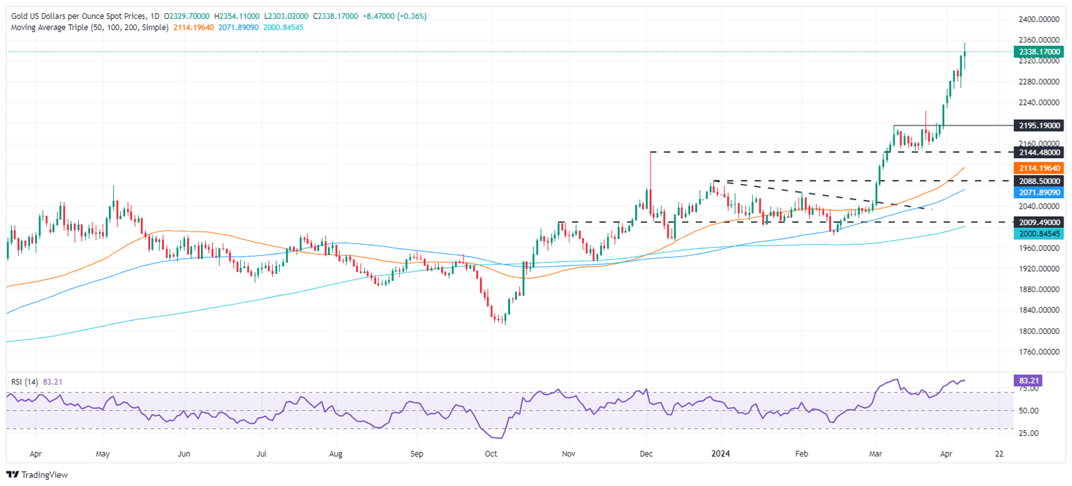 Gold price retreated on Monday after hitting all-time highs of $2,354 during the mid-North American session. The yellow metal advance continues amid higher US Treasury yields and less likelihood of additional rate cuts by the Federal Reserve (Fed). A stronger-than-expected US Nonfarm Payrolls report last Friday wasn’t an excuse for the non-yielding metal’s advance. At the time of writing, XAU/USD trades at $2,327, posting decent gains of 0.30%.