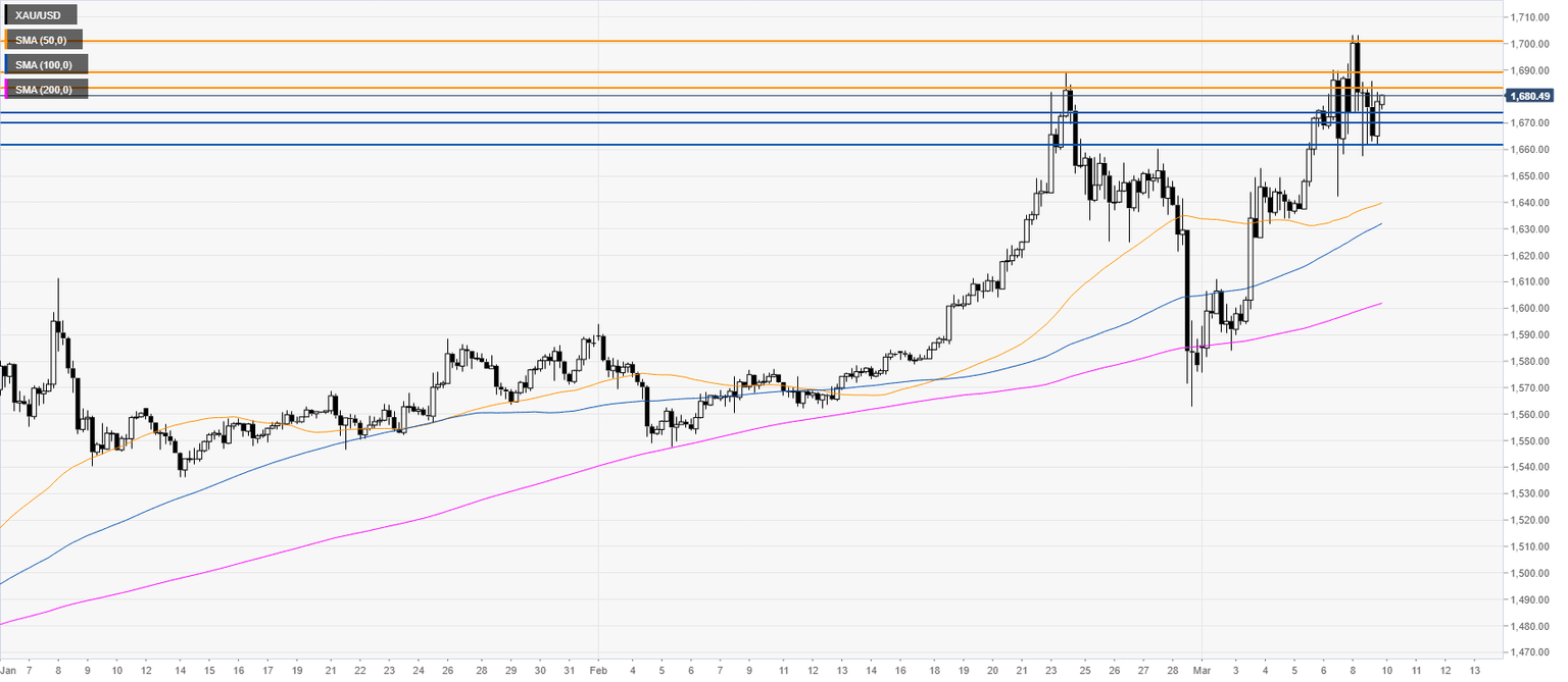 After reaching the 1700.00 mark, XAU/USD is consolidating gains while trading above its main SMAs. Buyers stay in control although the metal arguably formed a double top/higher high with the February highs which bulls have now to overcome. Support should be expected in the 1674.72/1663.00 price zone, according to the Technical Confluences Indicator.