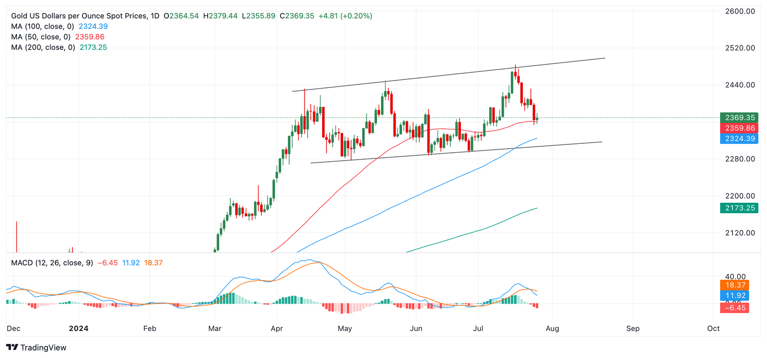 Gold trades in the $2,370s per ounce on Friday after recovering from the 50-day Simple Moving Average (SMA), as technical traders scalp the bounce after the steep drop of the previous day. Gold sold off by over 1.0% on Thursday as it ran with the commodity pack lower, which declined as a group on global growth fears.