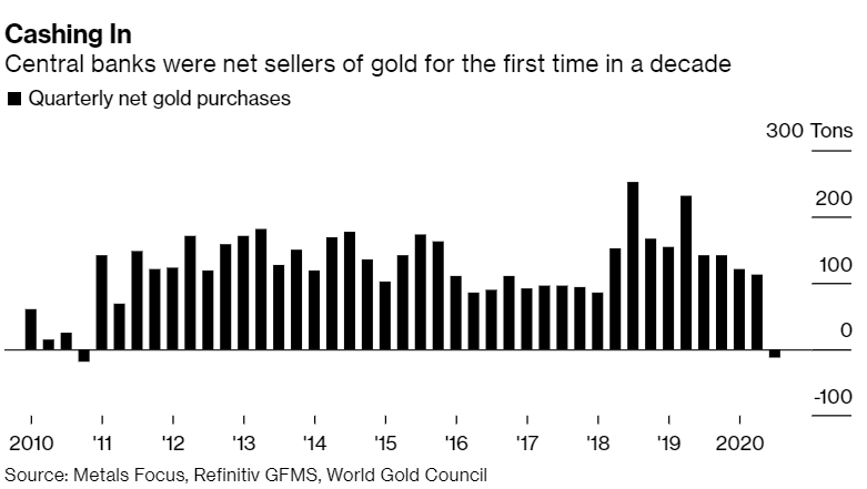 Taking advantage of the near-record high prices in order to cushion the economic shock from the coronavirus pandemic, central banks have turned into gold sellers for the first time in a decade, Bloomberg cites a report published by the World Gold Council (WGC).