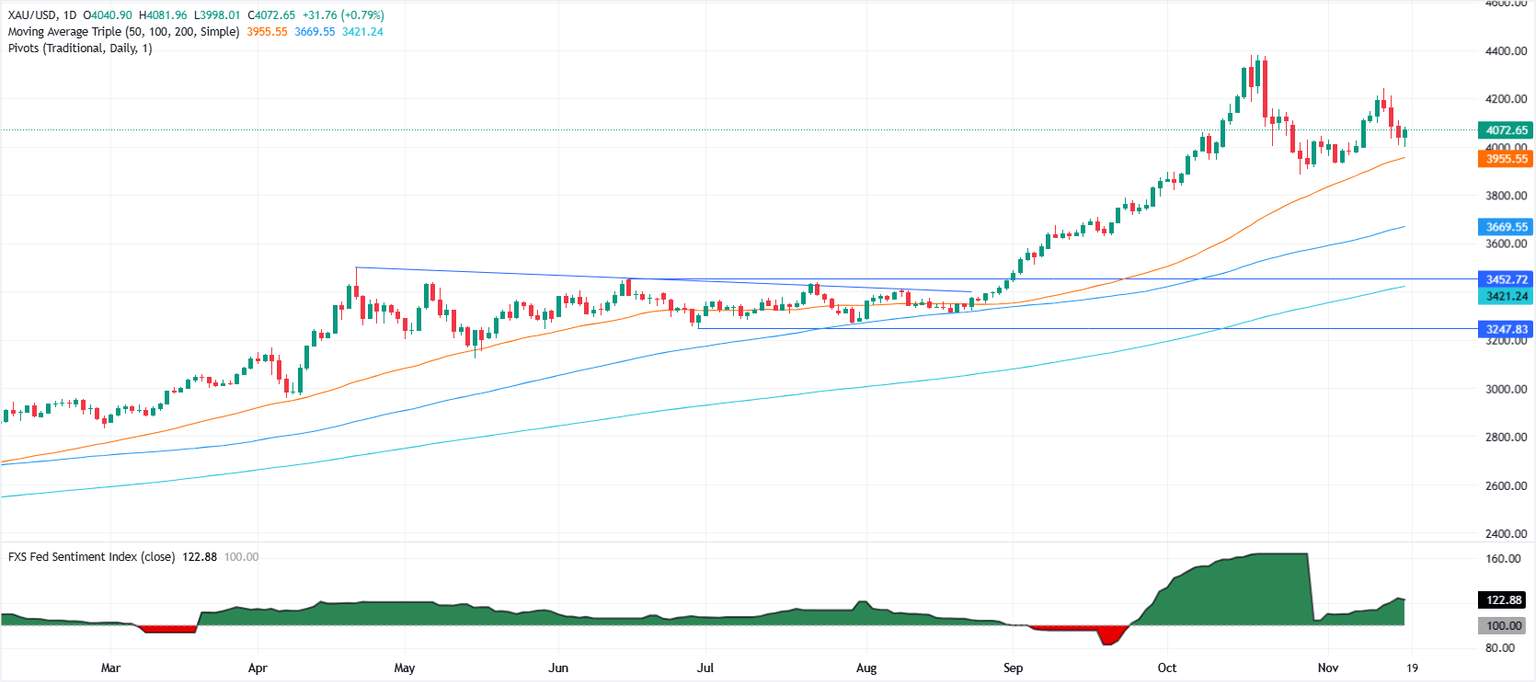 However, a failure to sustain gains above $4,050 would leave XAU/USD vulnerable to a pullback toward $4,000, followed by a potential test of the October 28 low near $3,886.
