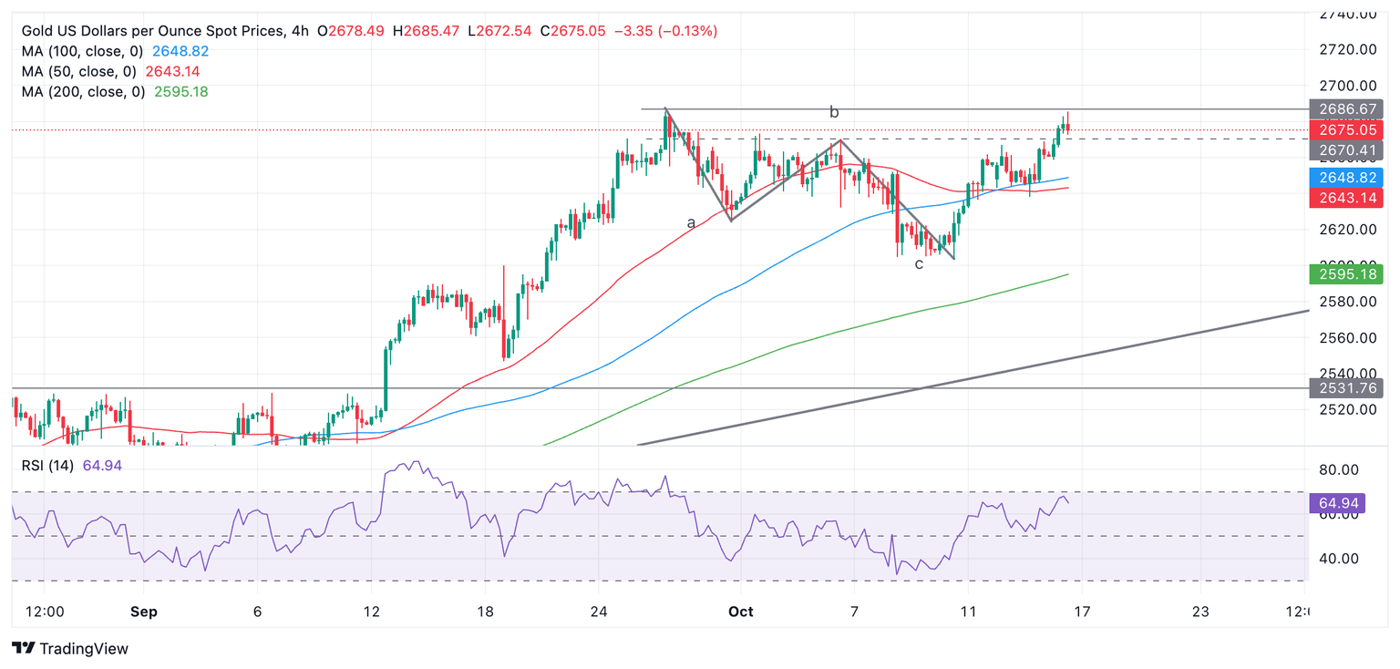 Gold has broken above key resistance at around $2,670, and it is closing in on the $2,685 all-time high. A break above that level would indicate a continuation to the next target at $2,700 – a round number and psychological level.