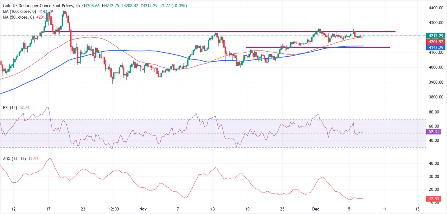 Gold (XAU/USD) remains range-bound, with repeated dip-buying interest emerging in the $4,200-$4,180 zone. On the 4-hour chart, the 50-period Simple Moving Average (SMA) is acting as immediate dynamic support near $4,201, while the 100-period SMA around $4,143 provides a deeper cushion.