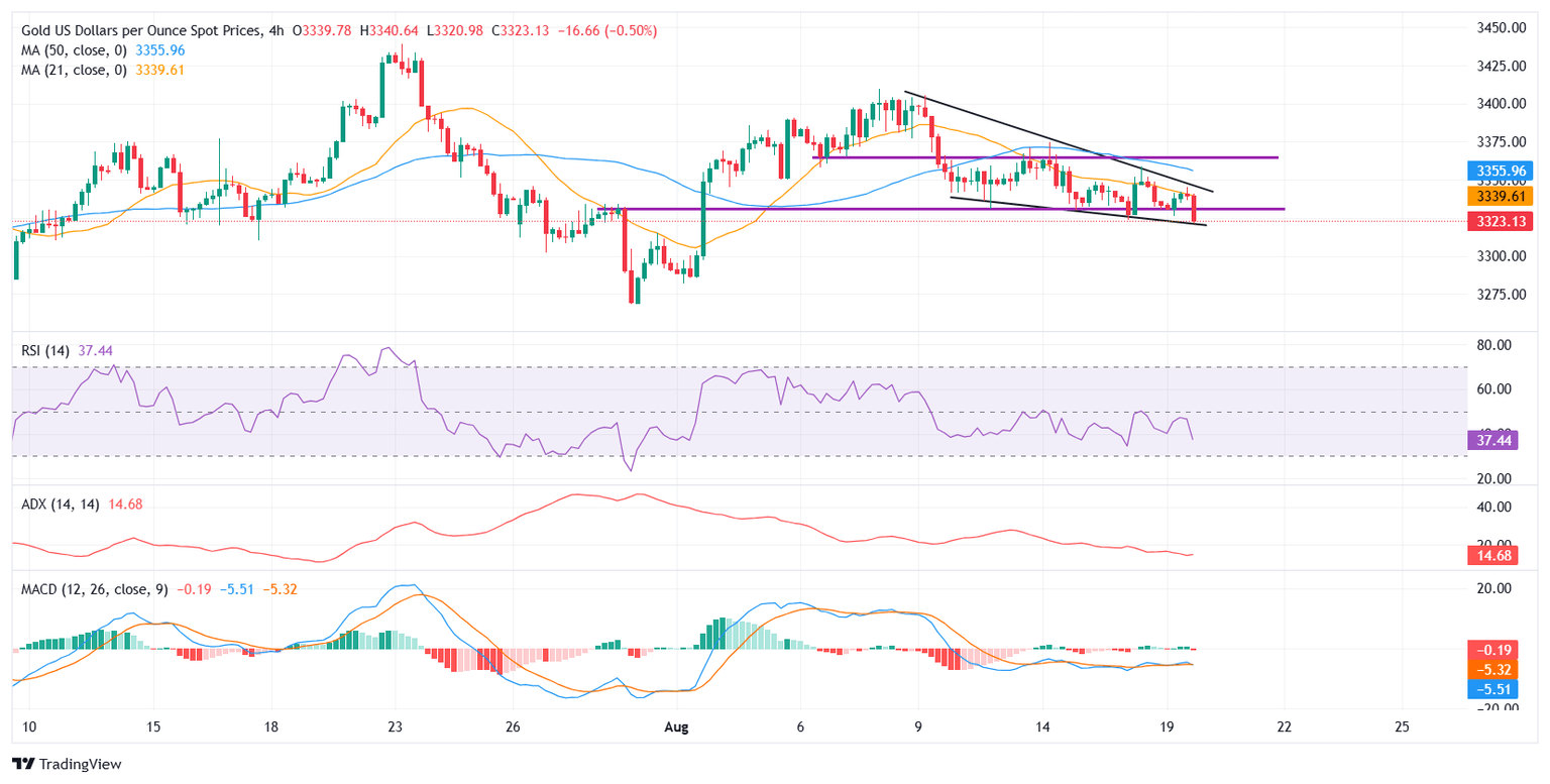 Gold (XAU/USD) edges lower during the American session on Tuesday, pressured by a firmer US Dollar and improved risk sentiment. The metal is trading near $3,320, close to the 12-day low marked during early Asian trade. Earlier in the day, Gold had briefly rebounded from overnight weakness following Monday’s White House summit between US President Donald Trump, Ukrainian President Volodymyr Zelenskyy, and key European leaders. While the talks signaled diplomatic unity, the lack of a ceasefire continues to keep geopolitical uncertainty elevated, providing some underlying support to safe-haven flows.