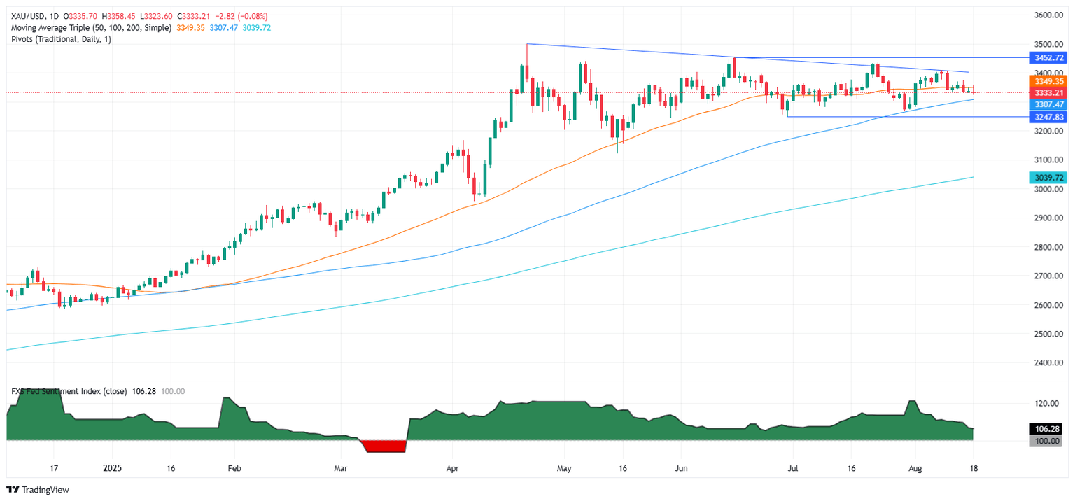 Gold price traded sideways on Monday as traders await the meeting between Trump, Zelenskiy, and European leaders in Washington following last week's summit between US President Donald Trump and Russian President Vladimir Putin. Growing speculation of a ceasefire on a peace deal caps Bullion prices, which trade near $3,330, virtually unchanged.
