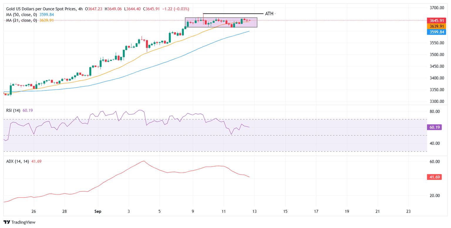 - Gold consolidates near $3,650, holding in a narrow range after this week’s record high near $3,675.