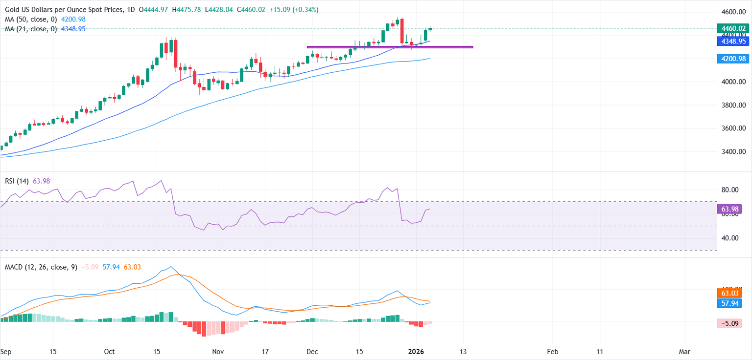 While safe-haven demand remains elevated, fresh buying has eased after Monday’s sharp advance as investors continue to monitor developments in the US-Venezuela relationship. Over the weekend, US armed forces captured and brought Venezuelan President Nicolas Maduro to New York, where Maduro is facing narco-terrorism and drug-trafficking charges.