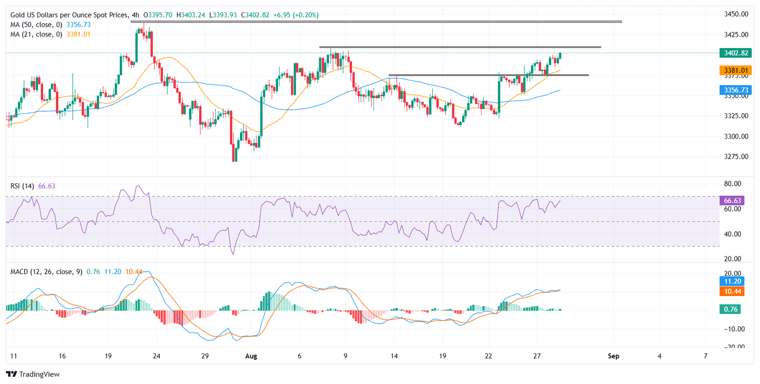 At the time of writing, XAU/USD is consolidating gains near the $3,411 mark as traders digest the latest United States (US) economic data. The second estimate of Q2 Gross Domestic Product (GDP) showed a 3.3% annualized expansion, beating the 3.1% forecast and up from 3.0% previously. The GDP Price Index and headline PCE Prices (prelim) both printed at 2.0%, slipping from 2.1%. Meanwhile, the preliminary Core PCE Price Index rose 2.5% QoQ, just below the 2.6% expected, while Initial Jobless Claims fell to 229,000, slightly better than the 230,000 consensus and down from a revised 234,000.