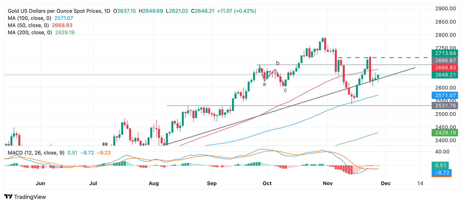 Gold (XAU/USD) extends its shallow recovery from Tuesday’s lows as it trades in the $2,640s on Thursday. The yellow metal is seeing gains on the back of cementing market bets that the Federal Reserve (Fed) will go ahead and cut US interest rates at its December meeting. Lower interest rates are positive for Gold as they reduce the opportunity cost of holding the non-interest-paying asset, making it more attractive to investors.