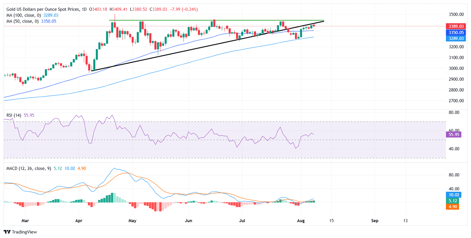 Gold (XAU/USD) remains capped below the key $3,400 resistance as bears continue to defend the psychological barrier. After peaking at $3,409 — a two-week high — earlier on Friday, the metal struggled to sustain upward momentum. Price action continues to respect a broader ascending triangle formation, though the structure weakened slightly last week when Gold briefly broke below the rising trendline. That dip, however, found strong buying interest just above the 100-day Simple Moving Average (SMA) at $3,289, helping bulls regain footing and maintain the overall bullish structure.