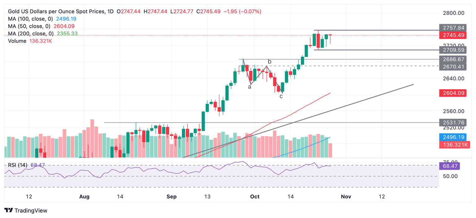 Gold trades in a mini range between $2,708 and $2,758 after peaking at the latter level and rolling over.