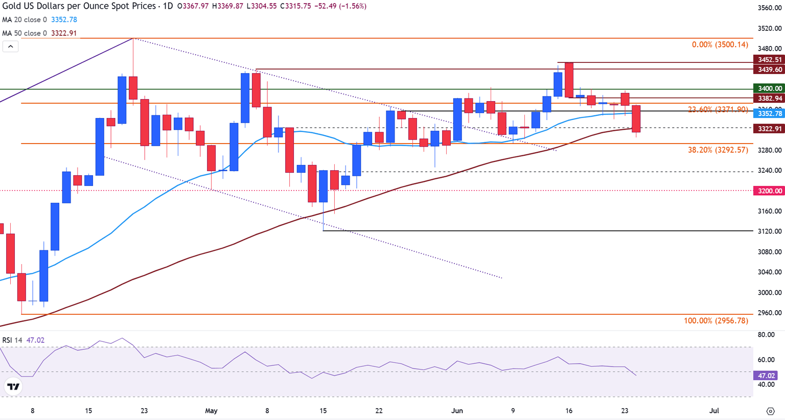 XAU/USD is currently trading near $3,315 after falling below the 50-day Simple Moving Average (SMA) on Tuesday. The 50-day SMA is providing immediate resistance at $3,322, with the 20-day SMA forming an additional barrier at $3,352.