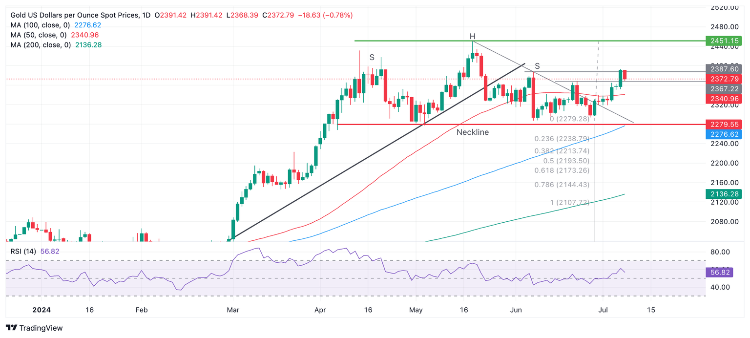 Gold trades in the $2,370s on Monday, after pulling back from Friday’s peak of $2,393 reached following the release of US NonFarm Payrolls (NFP) data.