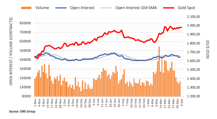 Prices of the ounce of troy of gold started the week on a positive foot and retested the $1990 region. The uptick was on the back of rising open interest and volume and this is indicative that further strength lies ahead for the precious metal. The next target on the upside, in the meantime, remains at the 2023 high at $2009 (March 20).